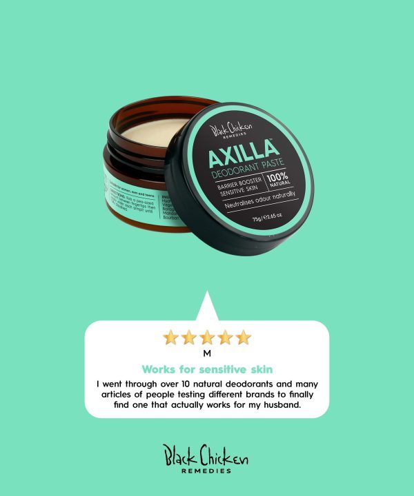 Axilla Deodorant Paste – Barrier Booster contains natural ingredients rich in lipids and fatty acids (essential for healthy cells) that can soothe and strengthen your sensitive skin. That means it helps to improve your skin’s ability to protect it from things that may cause irritation.