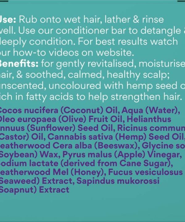 This unscented shampoo bar which contains Australian hemp seed oil and Leatherwood honey is perfect for those with sensitivities and dry, irritated scalp and hair. The essential fatty acids in the plant oils will hydrate, while the Leatherwood honey will soothe the scalp.