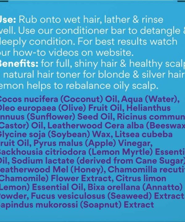 This Lemon & Chamomile Shampoo Bar is enriched with plant and nut oils, infused with soothing Chamomile, and scented with refreshing Lemon Myrtle and Litsea Cubeba essential oils.