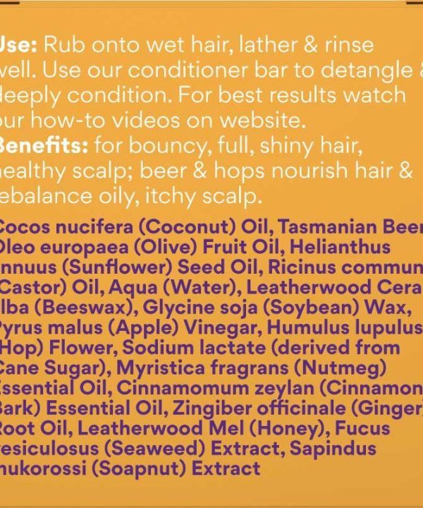 This solid shampoo bar is handmade with beer brewed locally in Tasmania by small breweries. It also contains fragrant hops and essential oils of ginger, nutmeg and cinnamon.